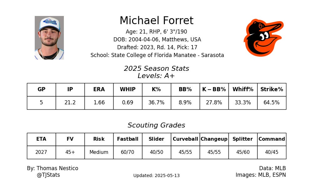 Forret wields an extremely deep arsenal headlined by a plus fastball. The command gains are the most important part of his development and make him one of the most intriguing arms in Baltimore's system.