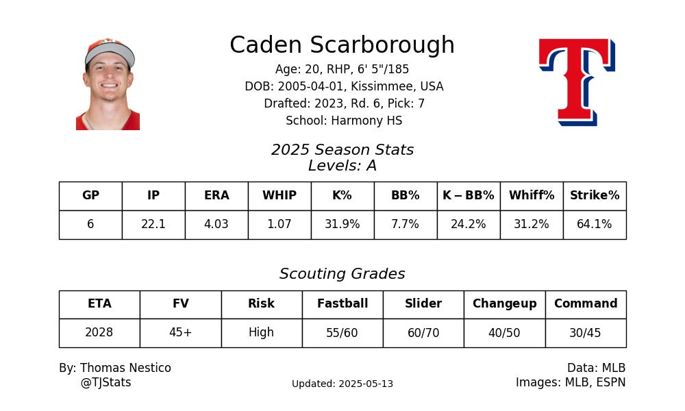 Caden Scarborough was selected in the 6th round of the 2023 draft out of Harmony High School but didn't make his pro debut until July 2024 following a strained lat. Despite the late start, Scarborough hit the ground running with an impressive display of athleticism and stuff.