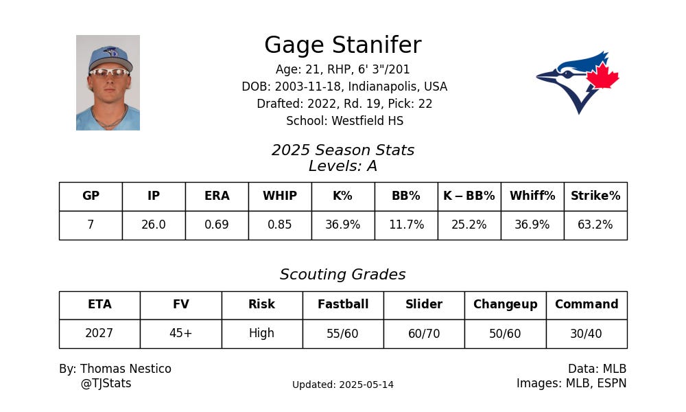 Gage Stanifer, a 19th round pick by Toronto in the 2022 draft, looks like he has found his footing in Lo-A this season. Stanifer's results are backed up by a substantial increase in velocity and overpowering 3-pitch mix. Stanifer stands at a sturdy 6'3" and 201 lb and utilizes a short arm stroke to add a layer of deception into his delivery. He doesn't get far down the mound with just 6 ft of extension, but he is able to release the ball from a 3/4 slot at a lower than average release point at 5.5 ft.