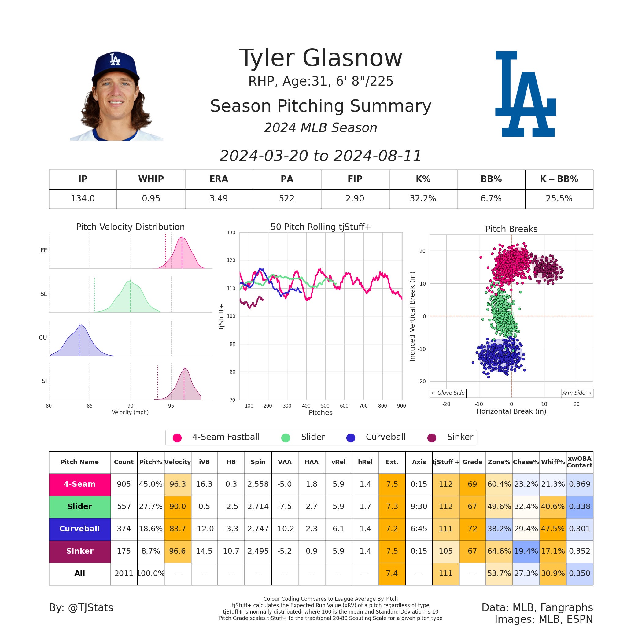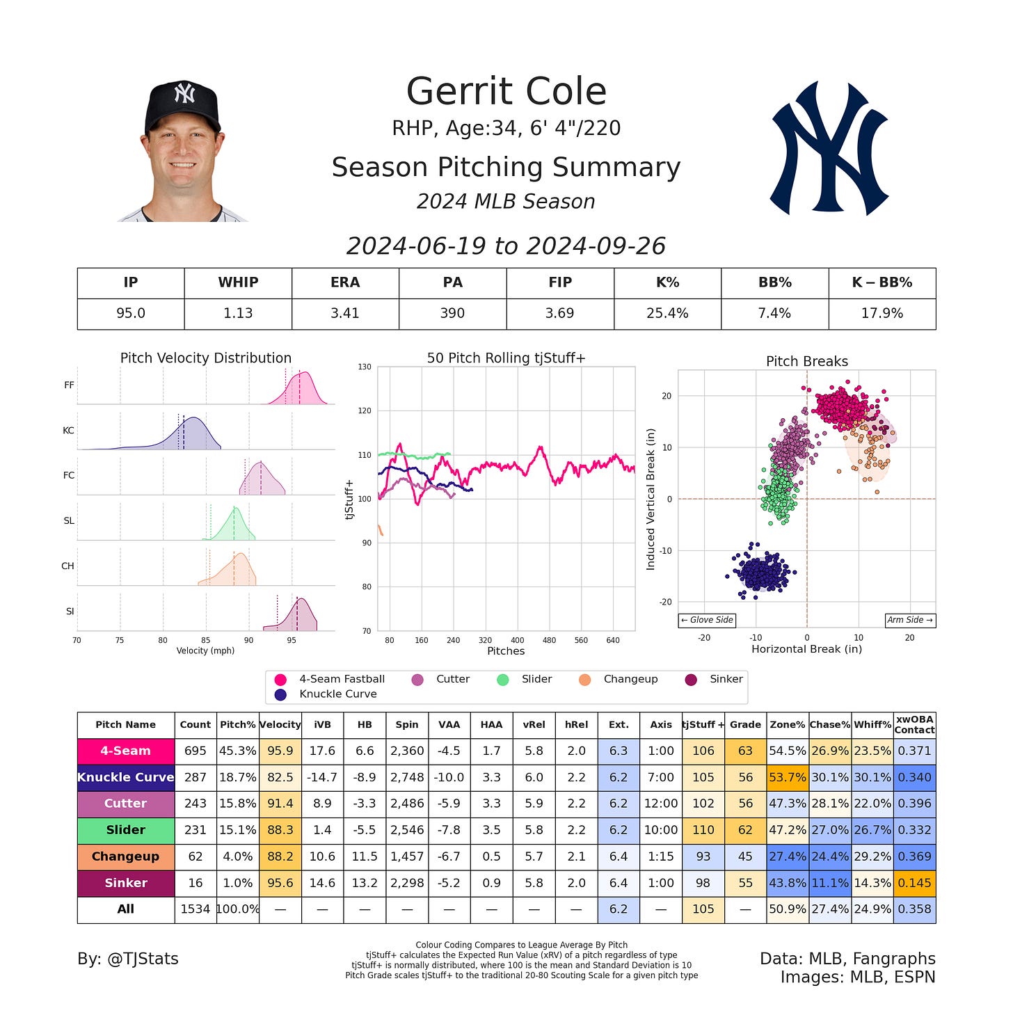 Gerrit Cole’s 2024 season started off on a sour note after he suffered an elbow injury in March and did not make his season debut until June. After his return, there was an obvious decline in stuff. His velocity was down ~1 MPH and his whiff rate dipped. It took him a handful of starts to get back into the swing of things where he ended the season looking like a frontline starter. Although his metrics were down across the board in the regular season, he had strong playoffs were his velocity rebounded to his 2023 levels. Steamer projects Cole as a high 3 ERA and FIP pitcher, which I think is much too harsh. I do believe his time as a top tier pitcher is most likely done, but he is still a very good arm.