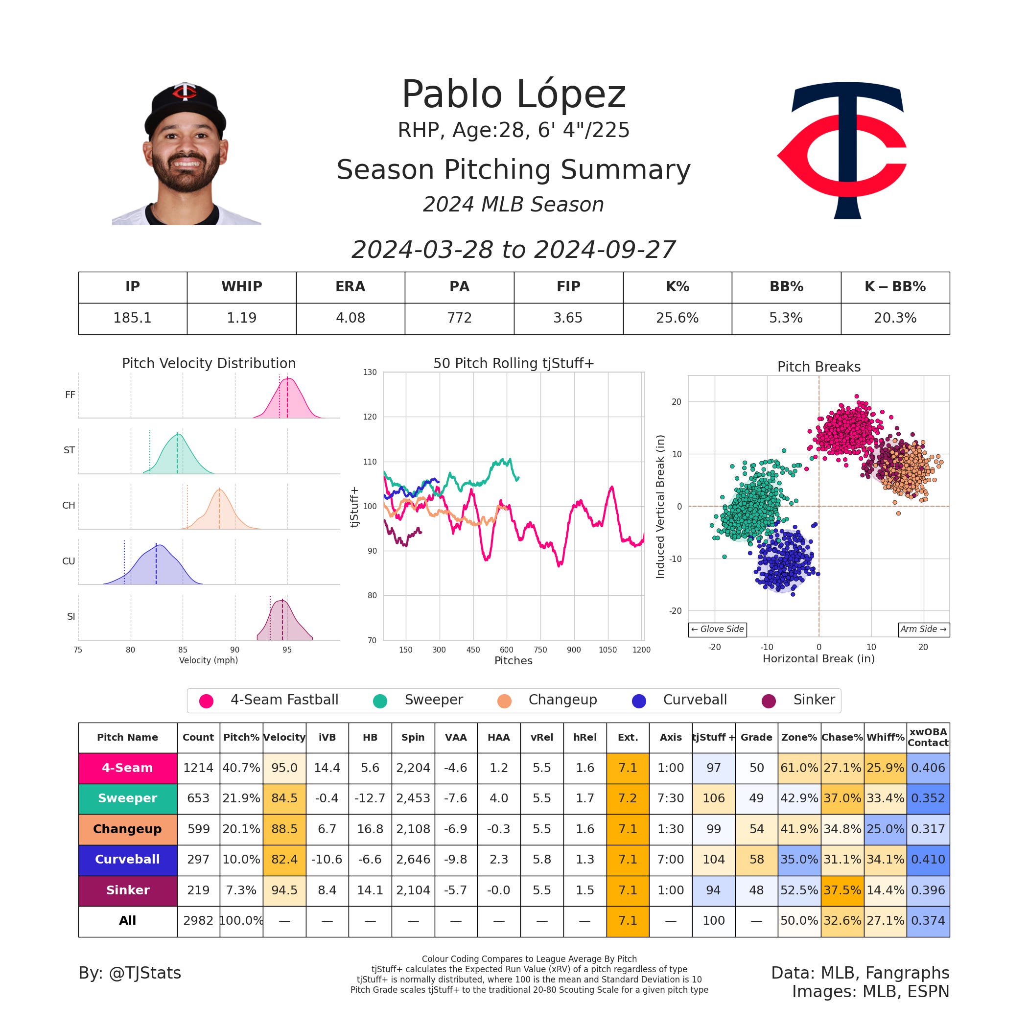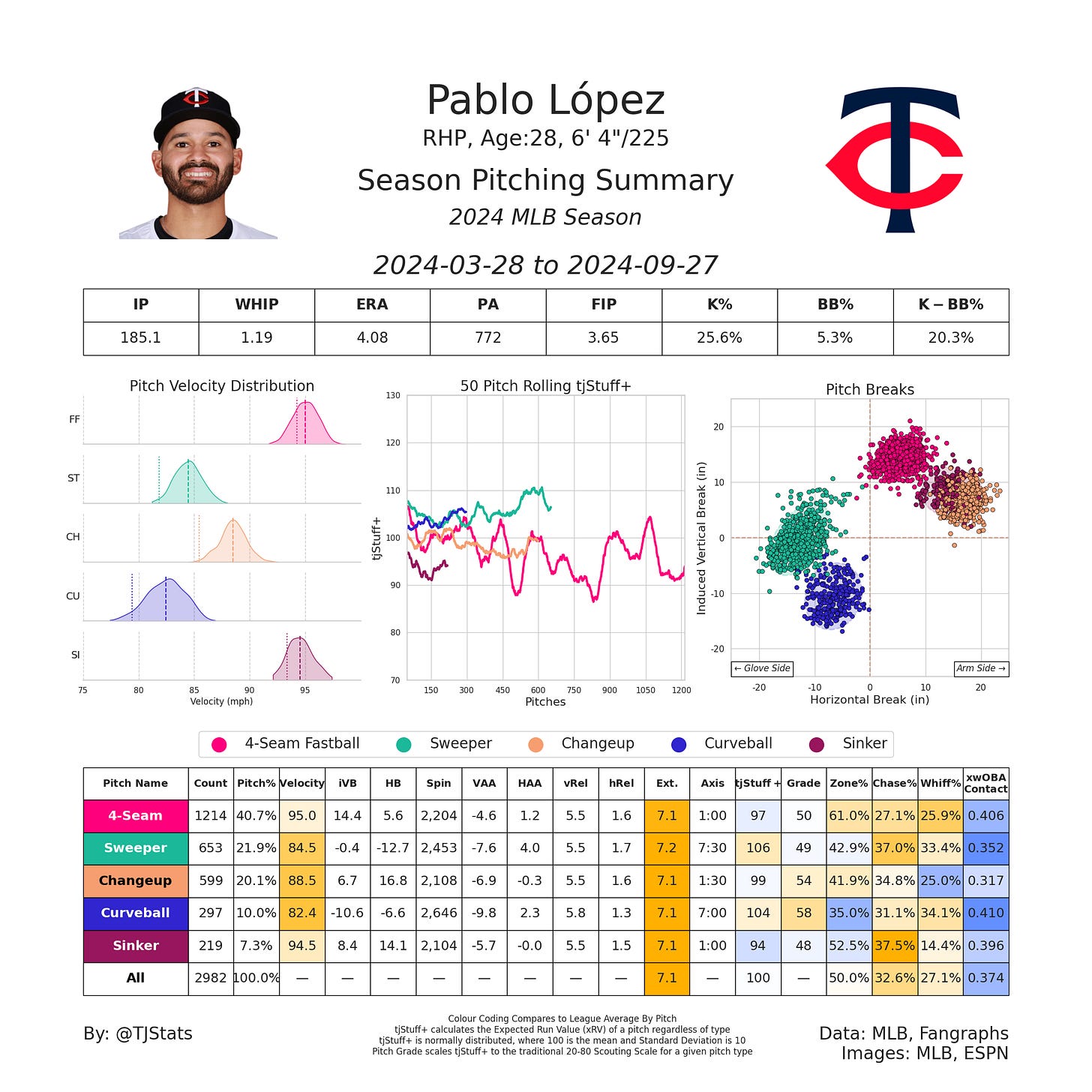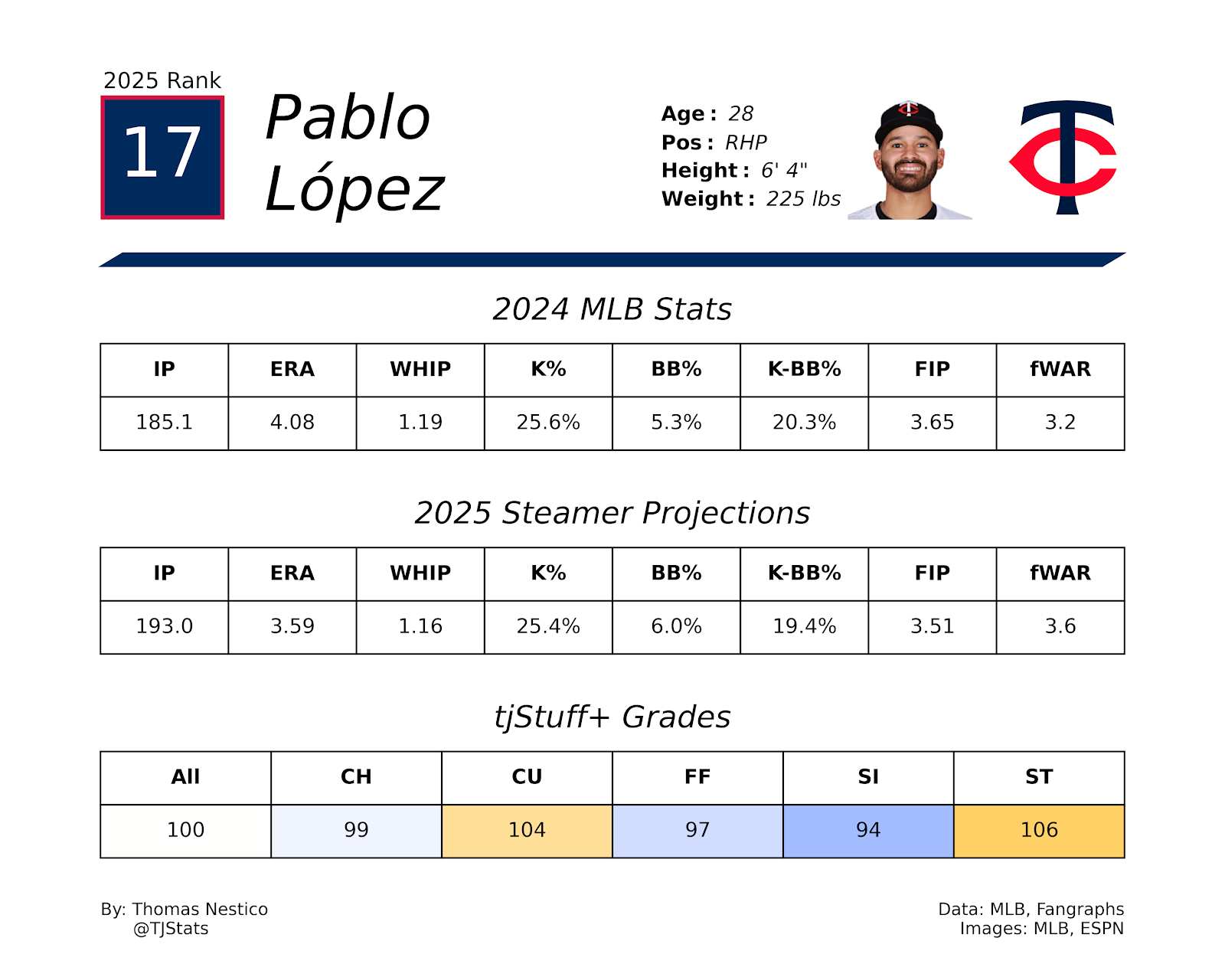 Pablo López’s 2024 season was one of peaks and valleys. His 1st half was marred by an ugly 5.11 ERA despite encouraging peripherals in his 3.84 FIP and 22.6 K-BB%. He righted the ship in the 2nd half with a 2.77 ERA and 3.40 FIP across 81.1 which saw his HR/FB% drop back down to league average levels. While I believe López is closer to his 2nd Half results, I am more bearish on him entering 2025 as we saw a drop in tjStuff+ in 2024 and he struggled to maintain his elite whiff rates. Even if his production slips to a #2/3 starter, he should have the volume to place him amongst the most valuable pitchers in baseball.