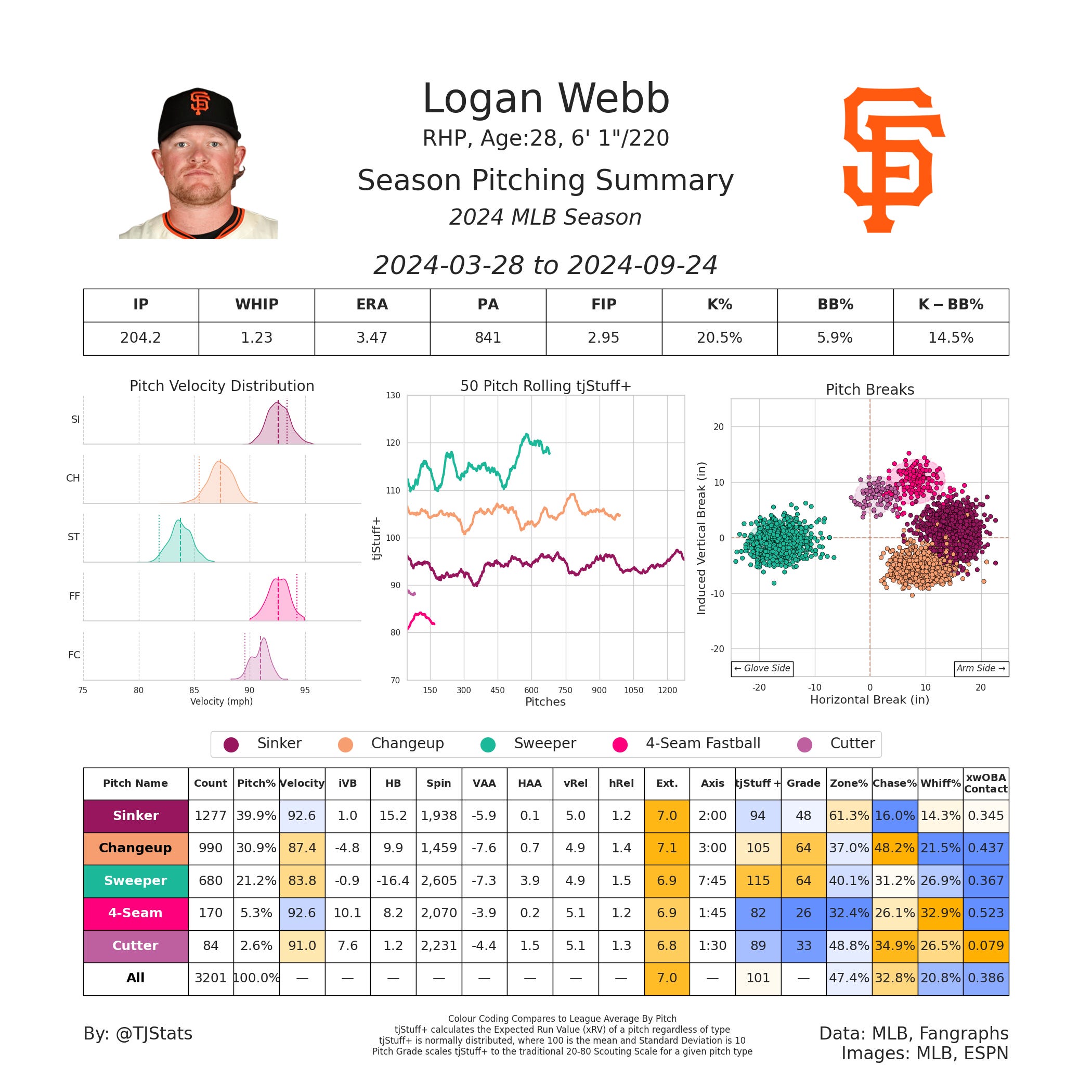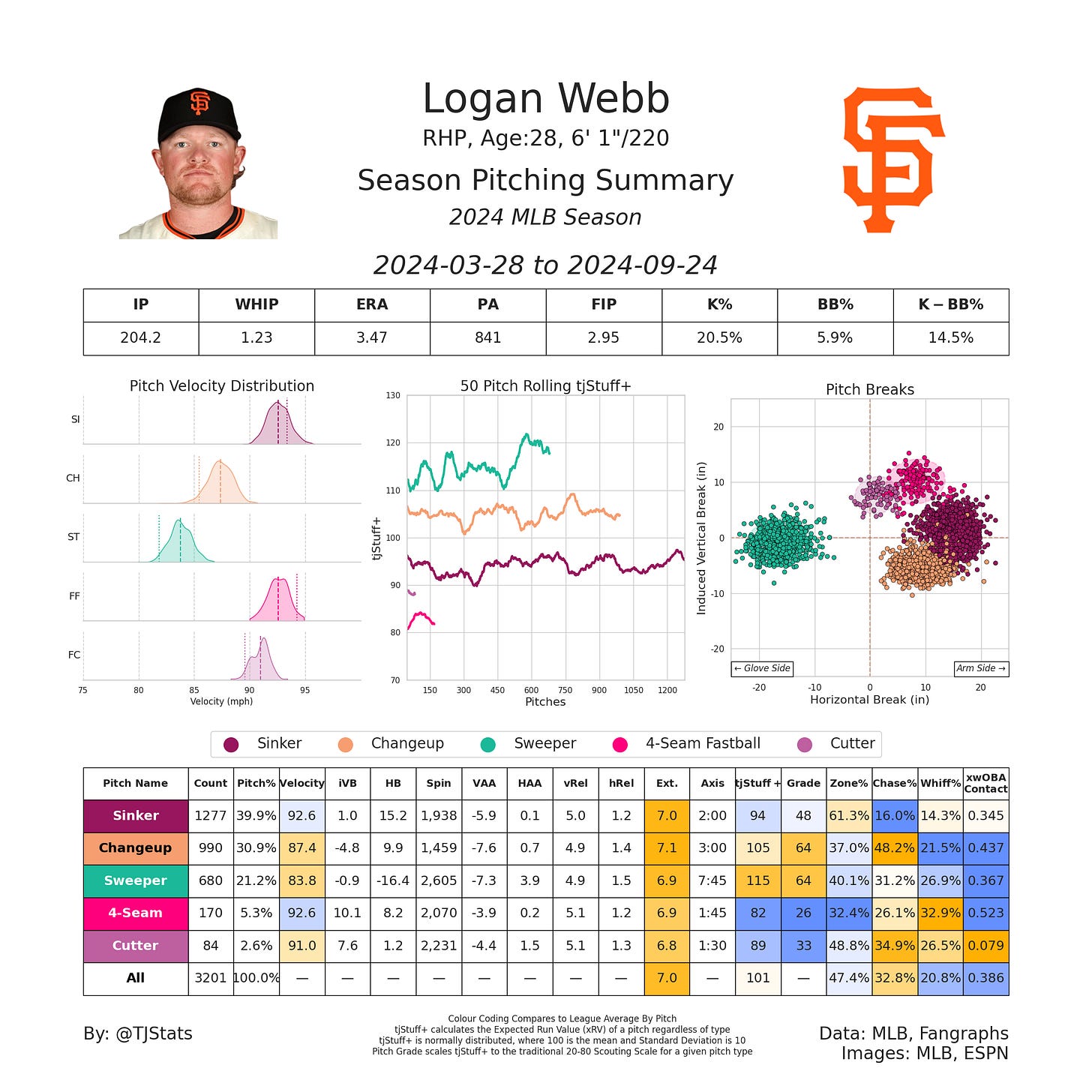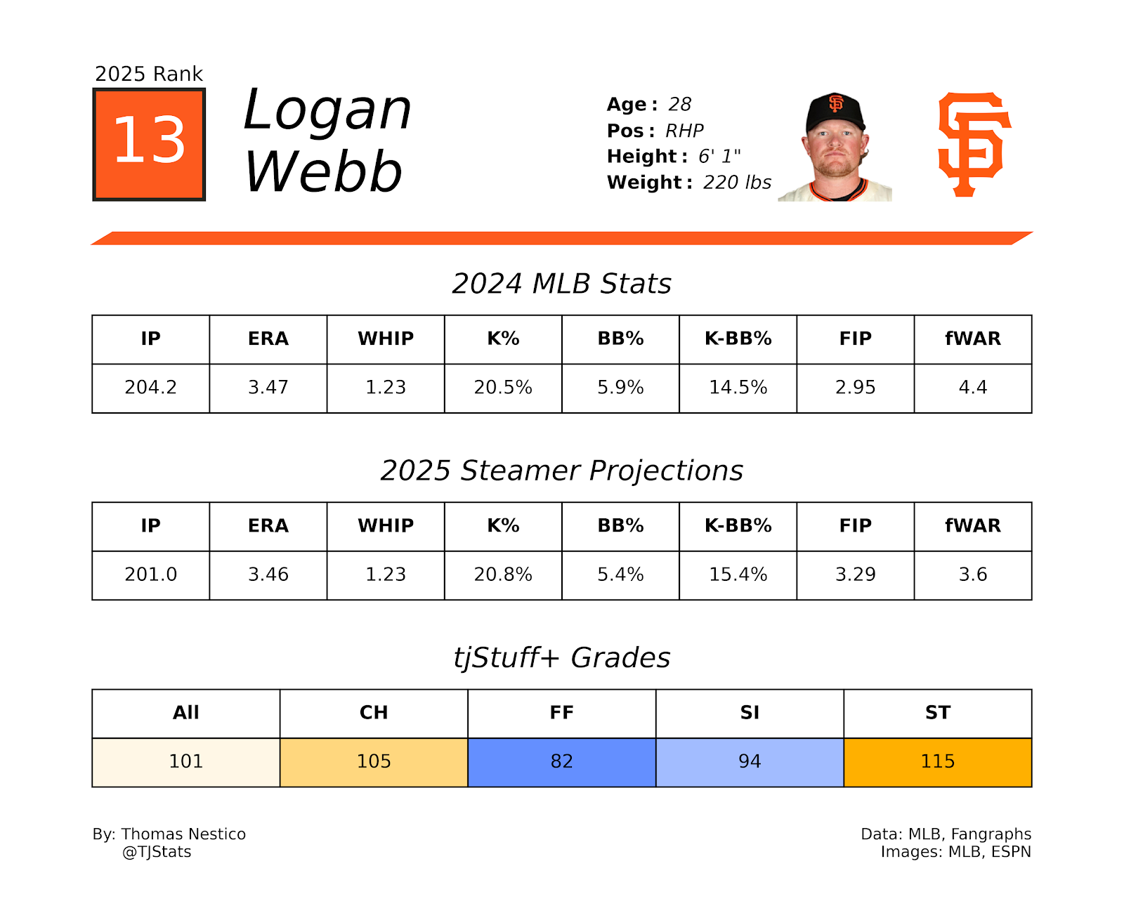 Logan Webb is the hungriest pitcher since 2022, tossing a whooping 613.0 IP while posting an excellent 3.05 FIP. His 100th percentile usage is very valuable, but his substandard K% and decline in changeup production make me more bearish than his counterparts.
