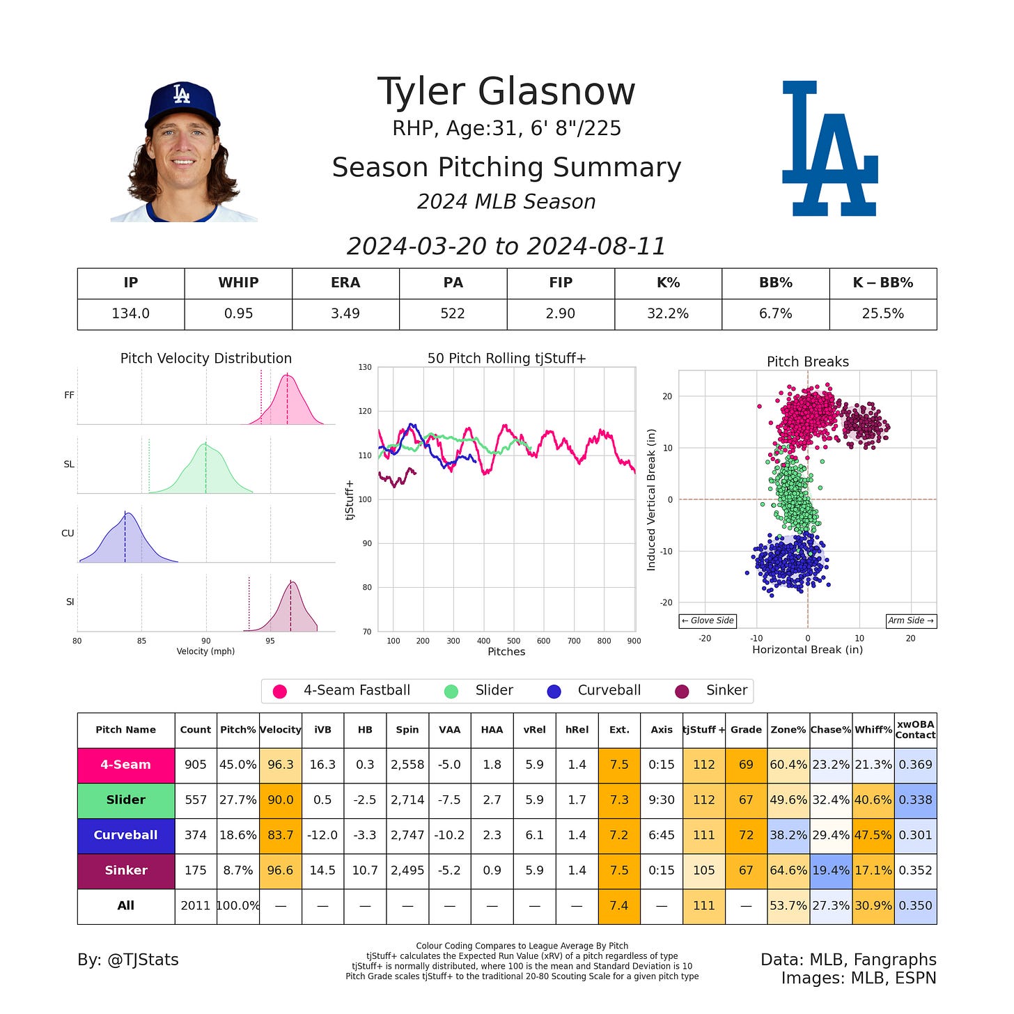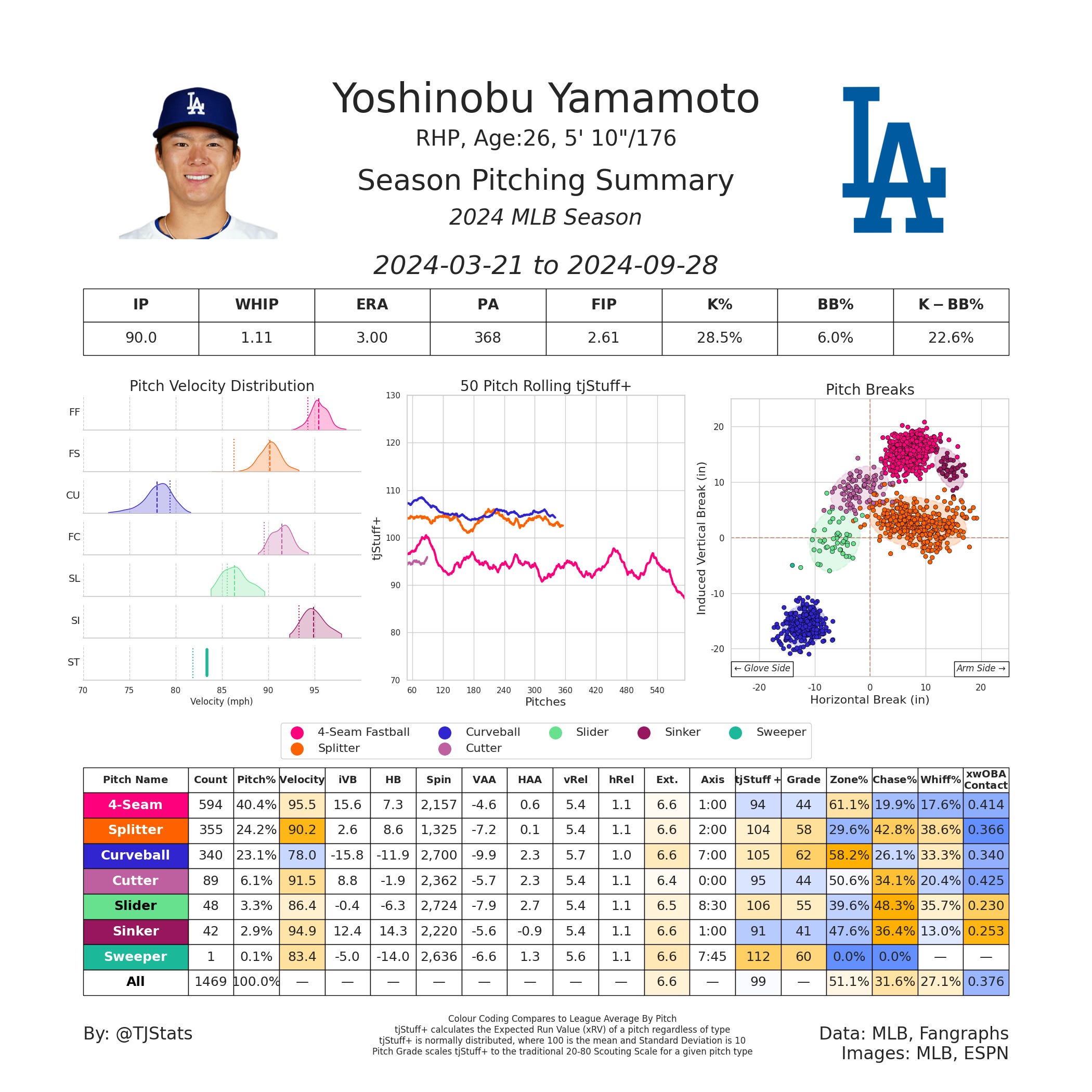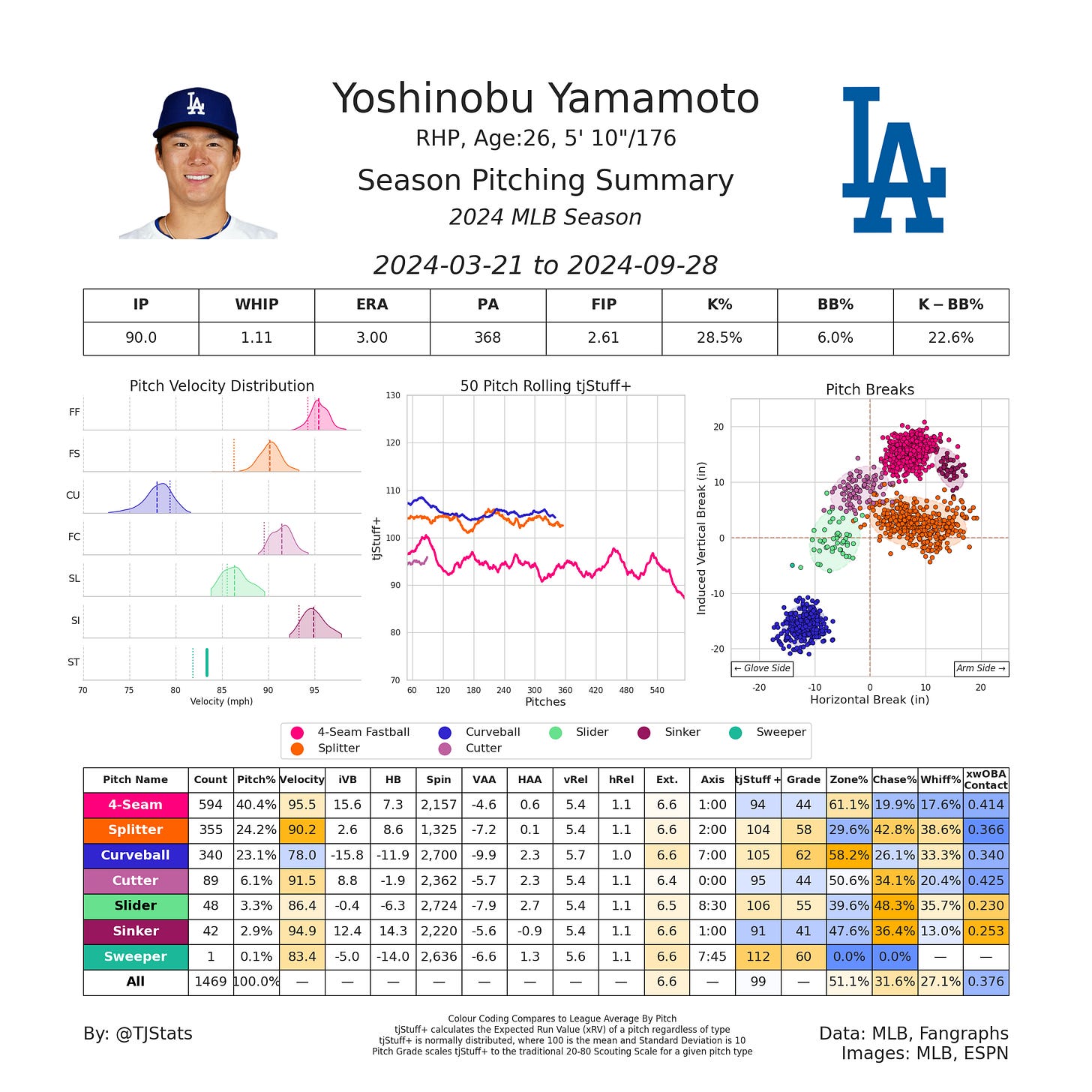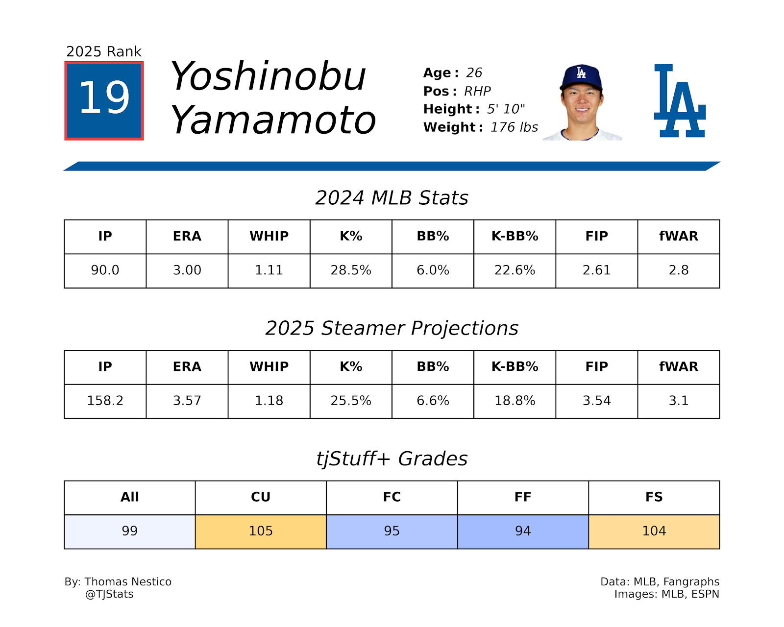 Yoshinobu Yamamoto was as advertised in his first MLB season. His stuff didn’t light the world on fire, but the command was pristine. He ability to pinpoint pitches on the edge of the strike zone was fascinating to watch and equally frustrating for batters. He unfortunately only tossed 90.0 IP in 2024 due to injury, and with a projected ~150 IP he will struggle to pitch enough to let his great ratios thrive. Despite the volume concerns, Yamamoto has the upside of a Top 10 pitcher with an extremely safe floor if his health holds up.