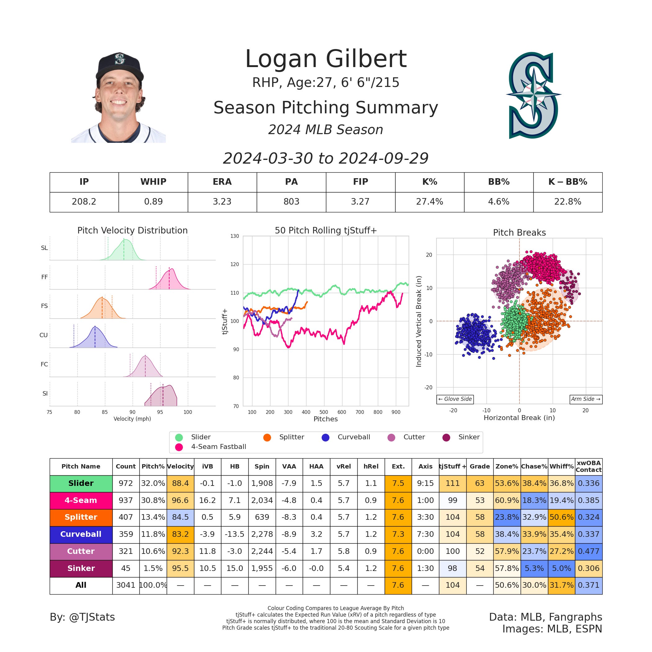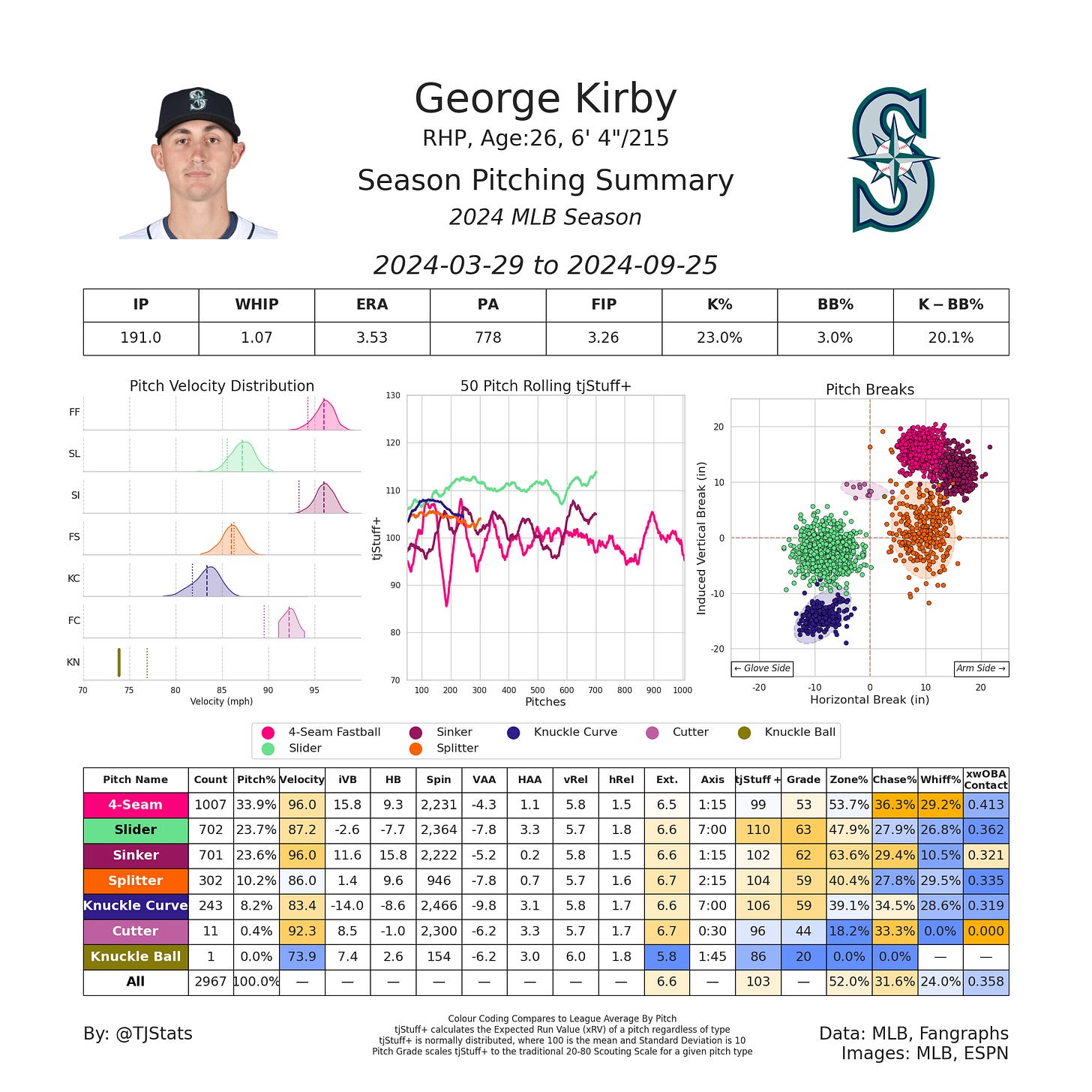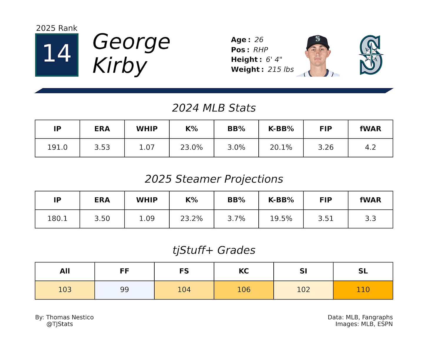George Kirby starts a stretch of innings eaters whose results have been great each of the last 3 seasons. Kirby is the command king and pitching half his games at T-Mobile Park lets strike zone pounding tendencies flourish. He hit a few speed bumps in 2024, most notably allowing a whopping 14 HR on his 4-Seam and struggling to generate whiffs on his secondaries. His command gives him such a lofty floor that any improvements to his jam-packed arsenal is the cherry on top.