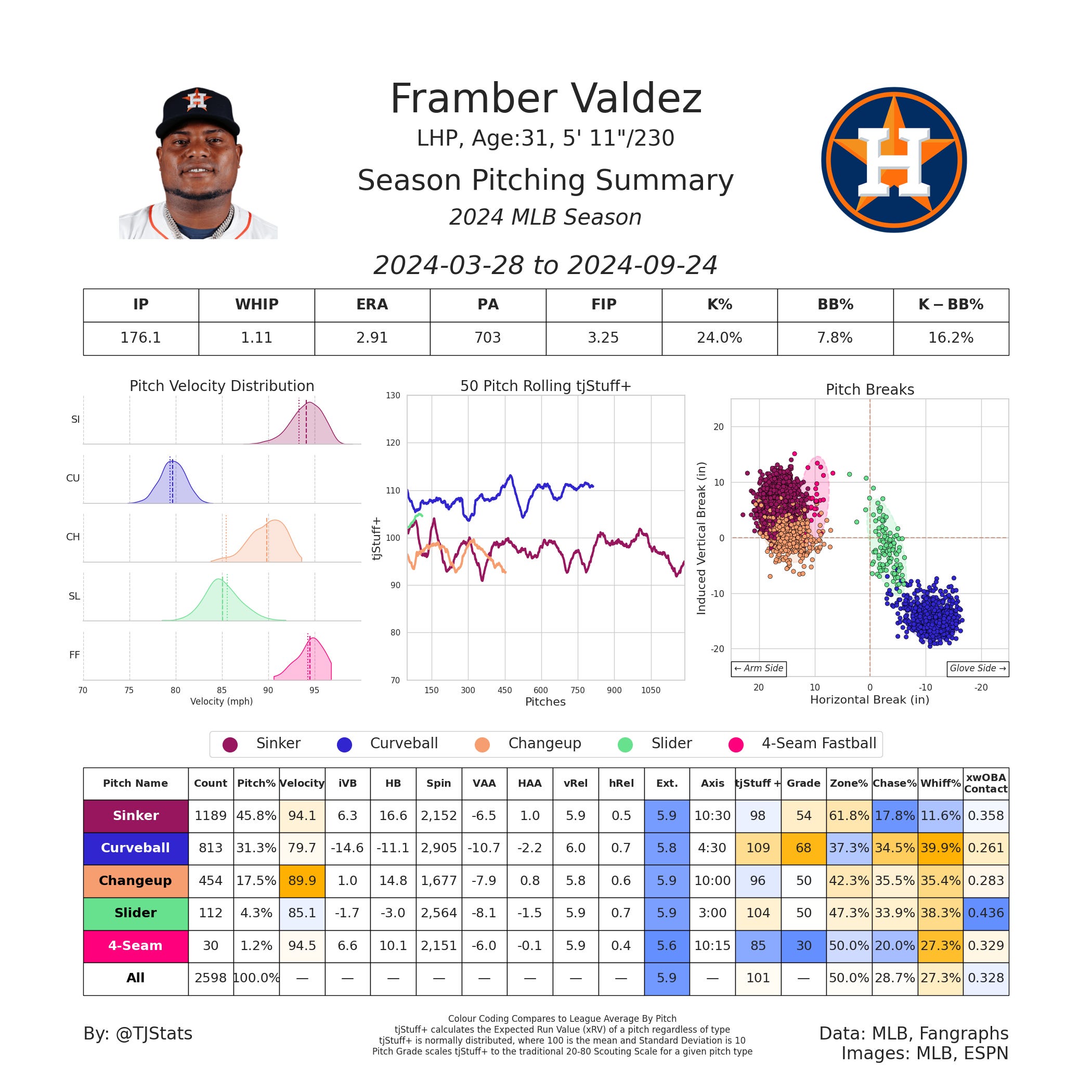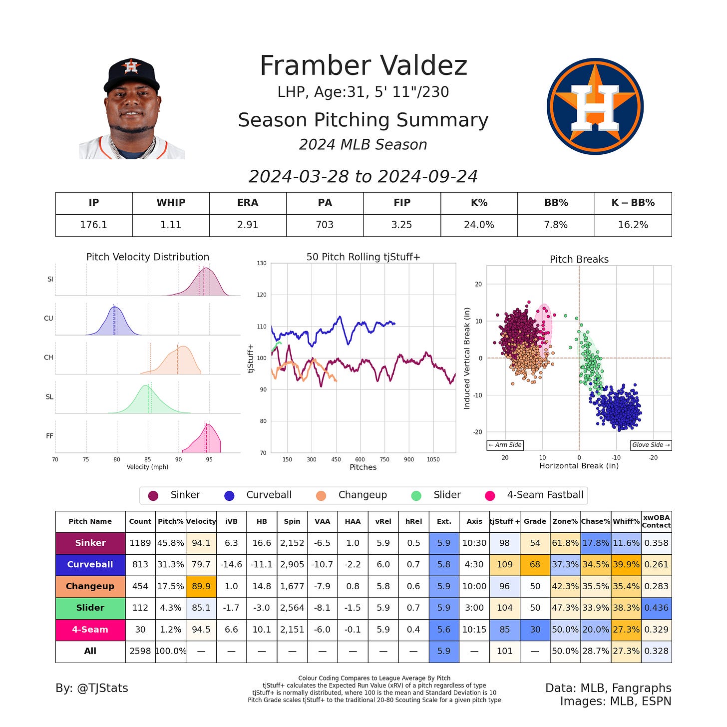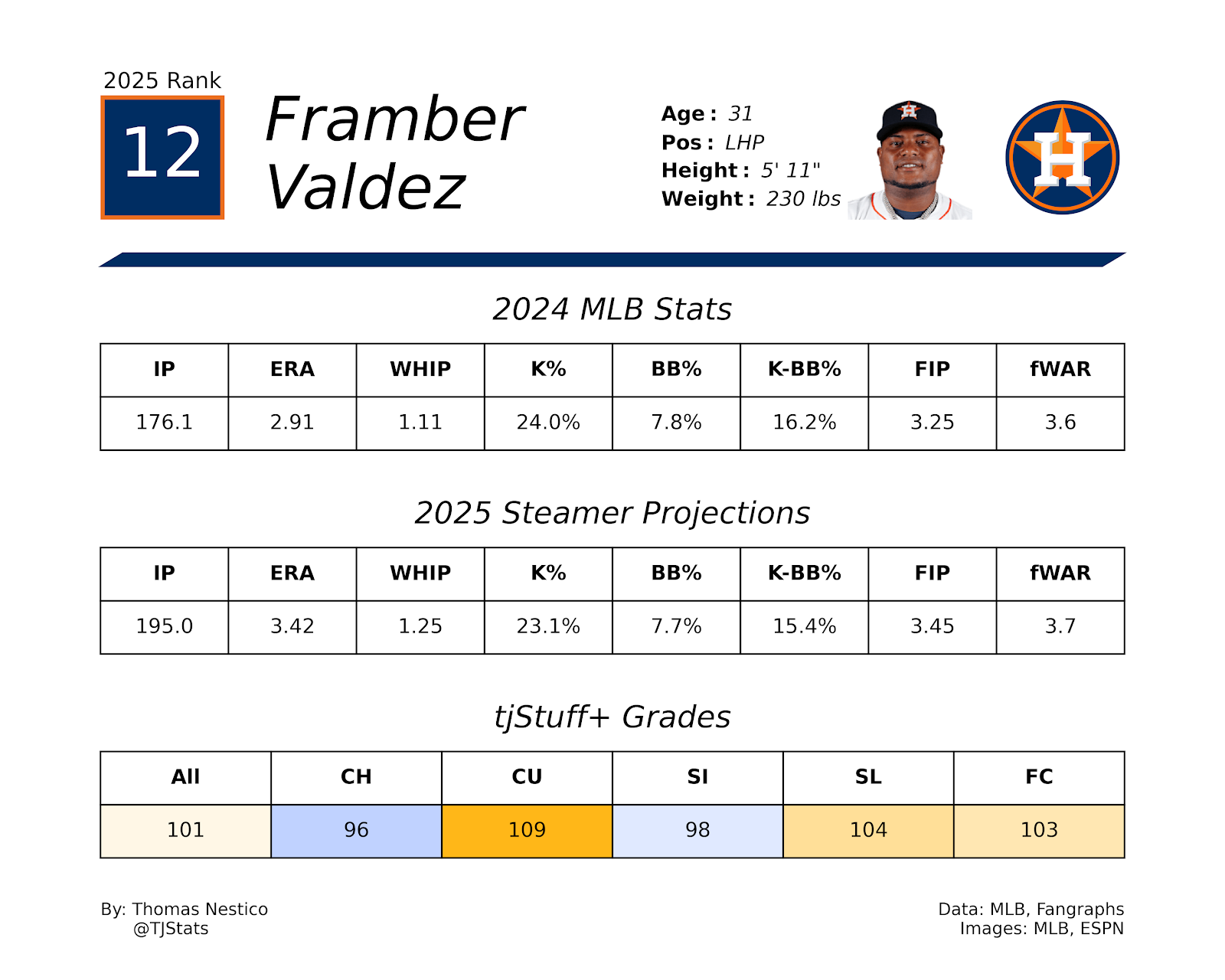 Framber Valdez follows Webb in the innings eater lineage. Valdez doesn’t possess the same volume as Webb, but he is more proficient are generating whiffs while being one of the most prolific groundball pitchers in MLB. Valdez’s ability neutralize batters with his sinker and curveball combo is a treat to watch and buoys his floor.
