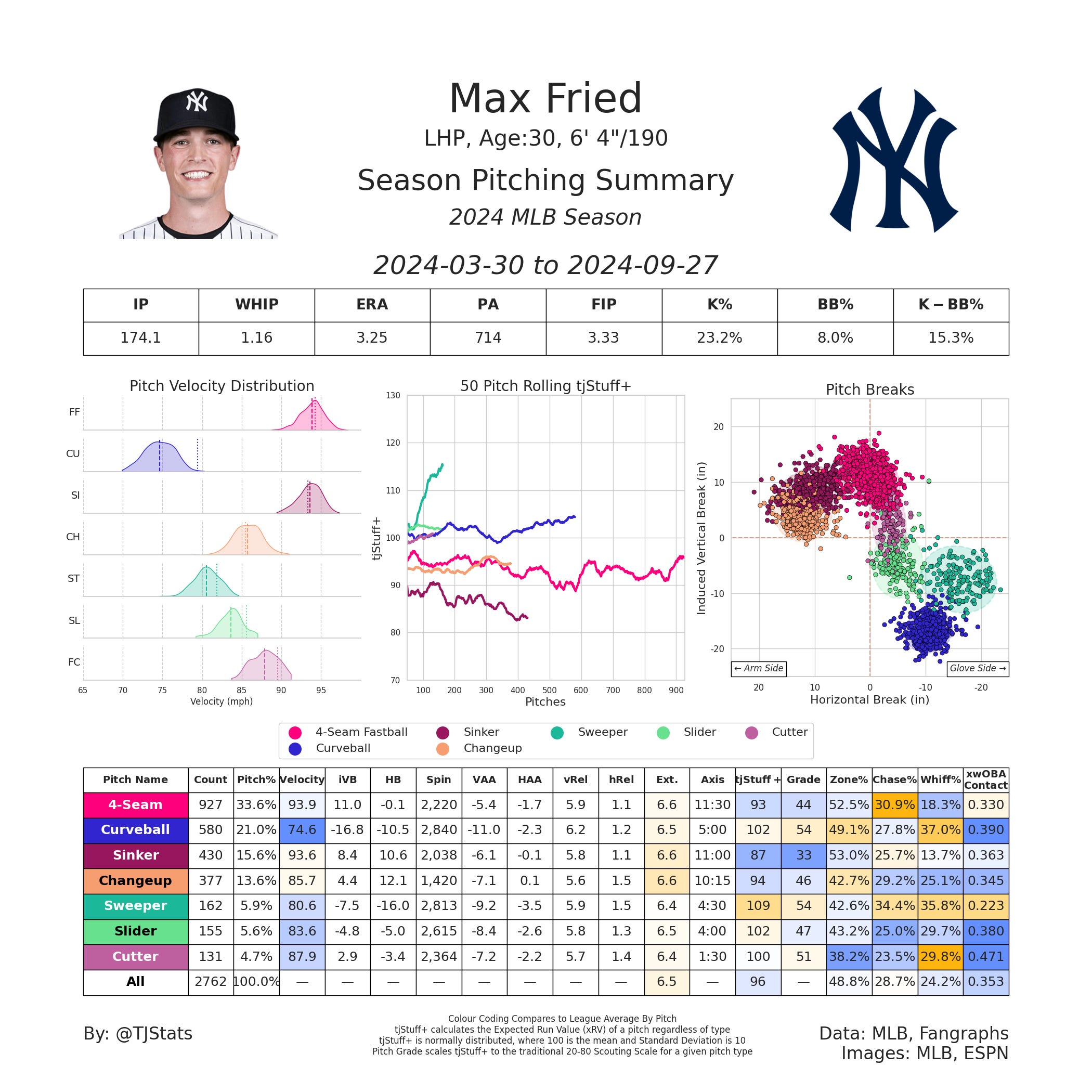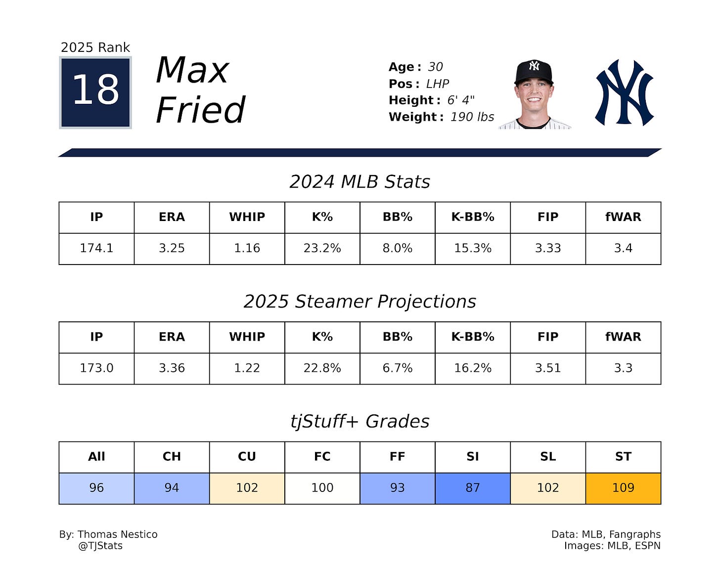 Max Fried is fresh off signing an 8 Year deal with the Yankees after posting an excellent season. His results have been akin to a frontline starter in his career thanks to top notch command and a seemingly never-ending arsenal. His lack of strikeouts limits his ceiling while forearms issues pose a risk to his floor. He has remained consistently superb throughout his career, and there are no signs that will change in 2025.