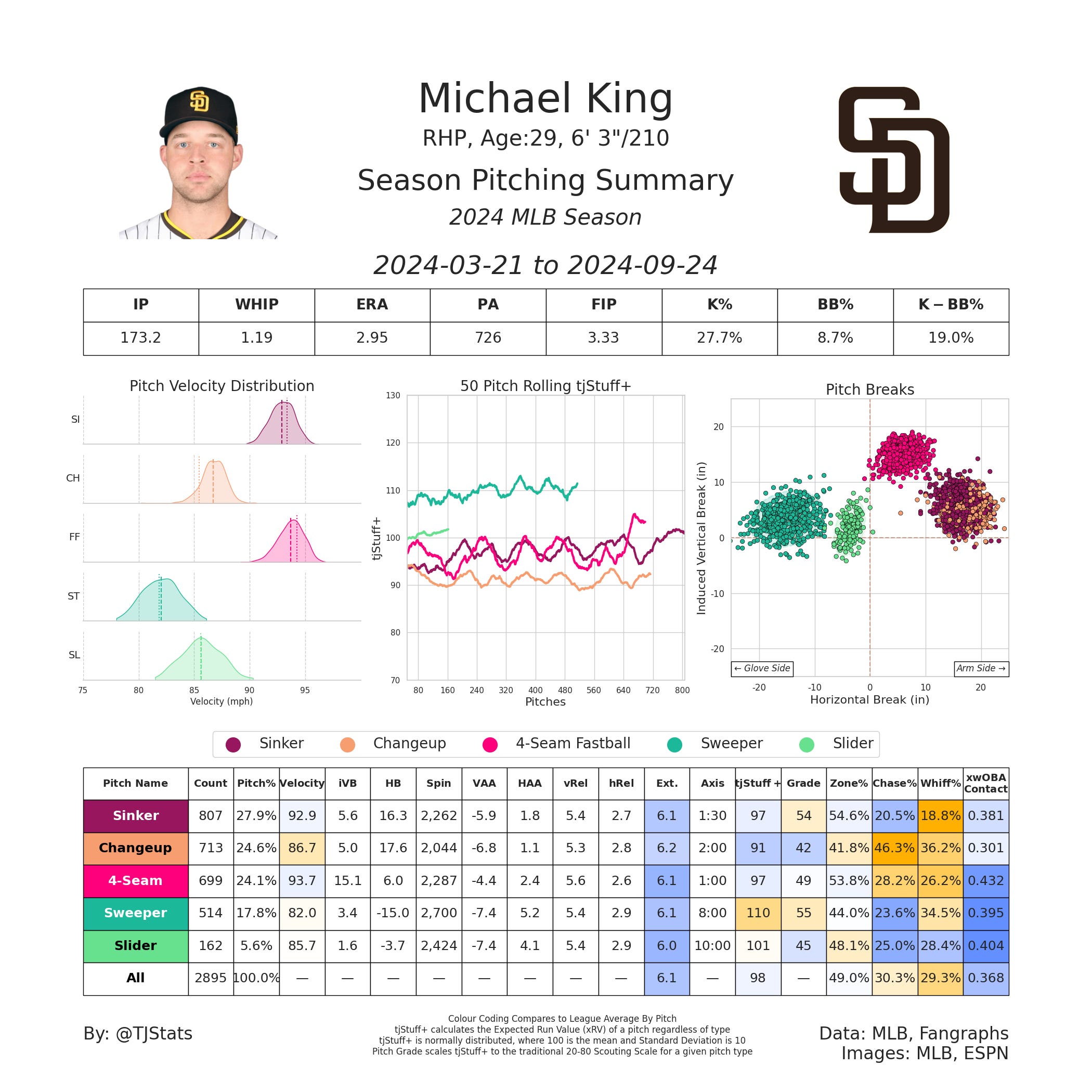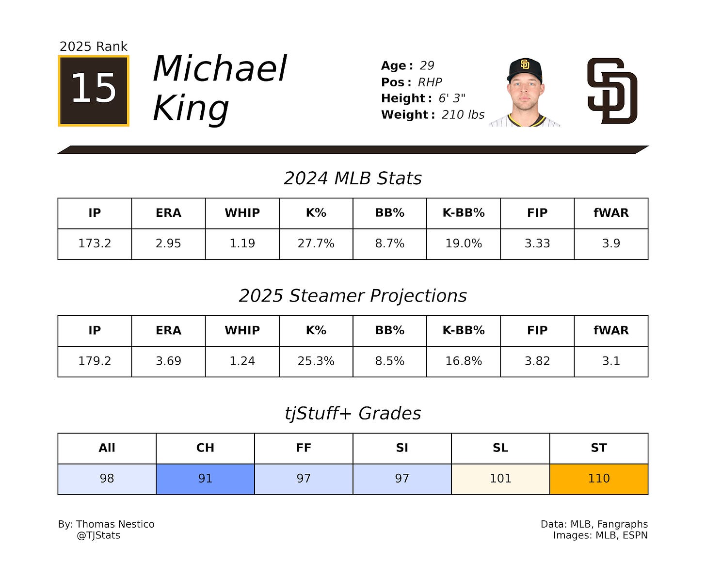 Michael King’s first season as a starter was a resounding success as he posted an outstanding 2.95 ERA and 3.33 ERA across 173.2 IP. Concerns about his workload and reliability were quickly laid to rest. He showed no signs of fatigue, and his production gradually improved as the season progressed. His changeup and sinker combo returned elite results, and he supported his arsenal with a flurry of secondaries. There does not seem to be a flaw in King’s game which warrants his high ranking, but his lack of high-end strikeout upside and volume keep him from slotting into the upper tiers.