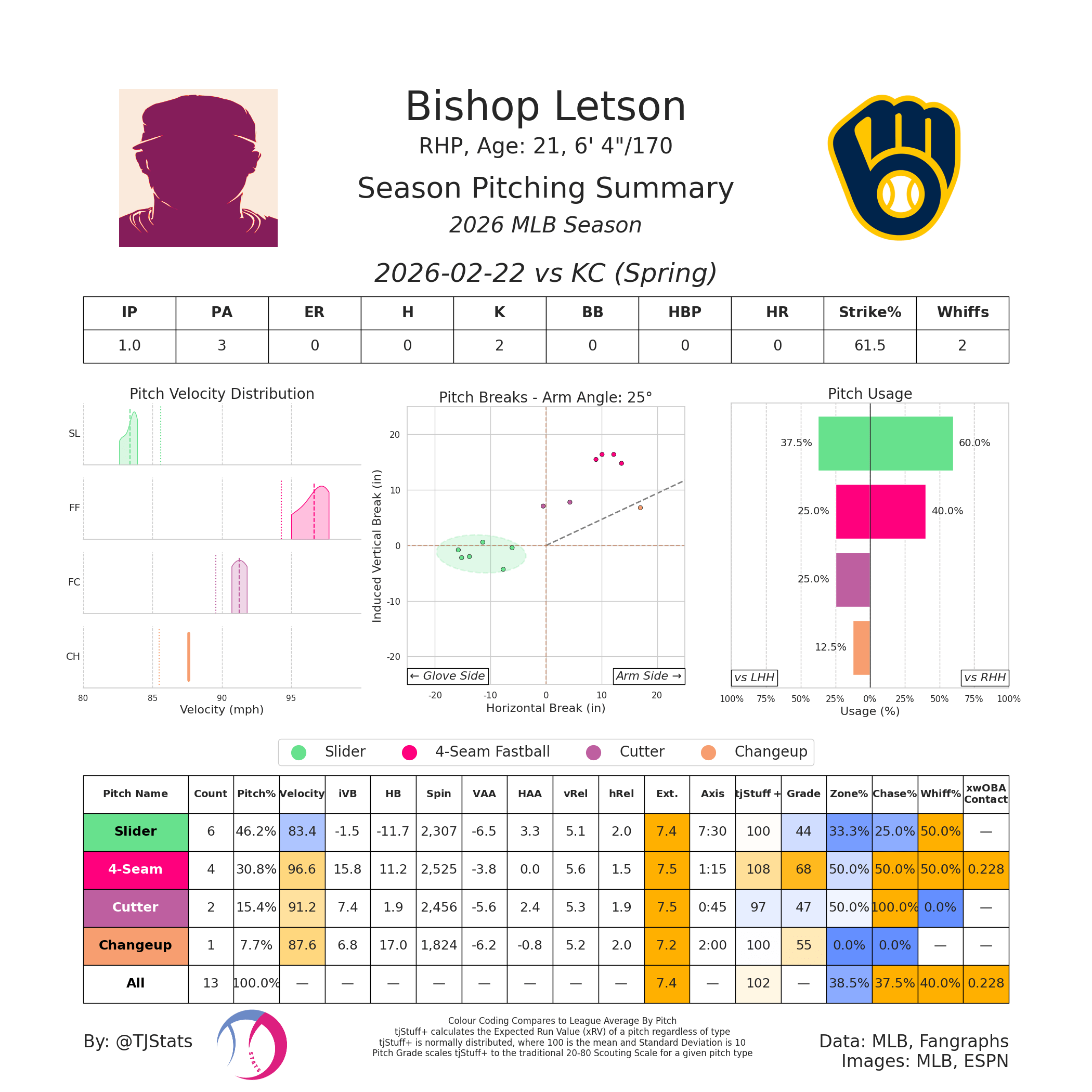 I will admit, I was not sold on Bishop Letson. The pitch shapes in 2025 were intriguing, but the velocity made me bearing on the slender righty. Those concerns quickly washed away as his fastball looked so much better than I anticipated. It averaged 96.6 MPH with an incredibly flat -3.8° VAA from his low 3/4 slot -- traits that push it into plus-plus territory. We also got a decent look at his big sweeping slider which was pivotal to his breakout 2025 season. He will be immediate addition to my next Top 100 Prospect update, and I expect many other outlets to follow suit -- this is a big name to watch.