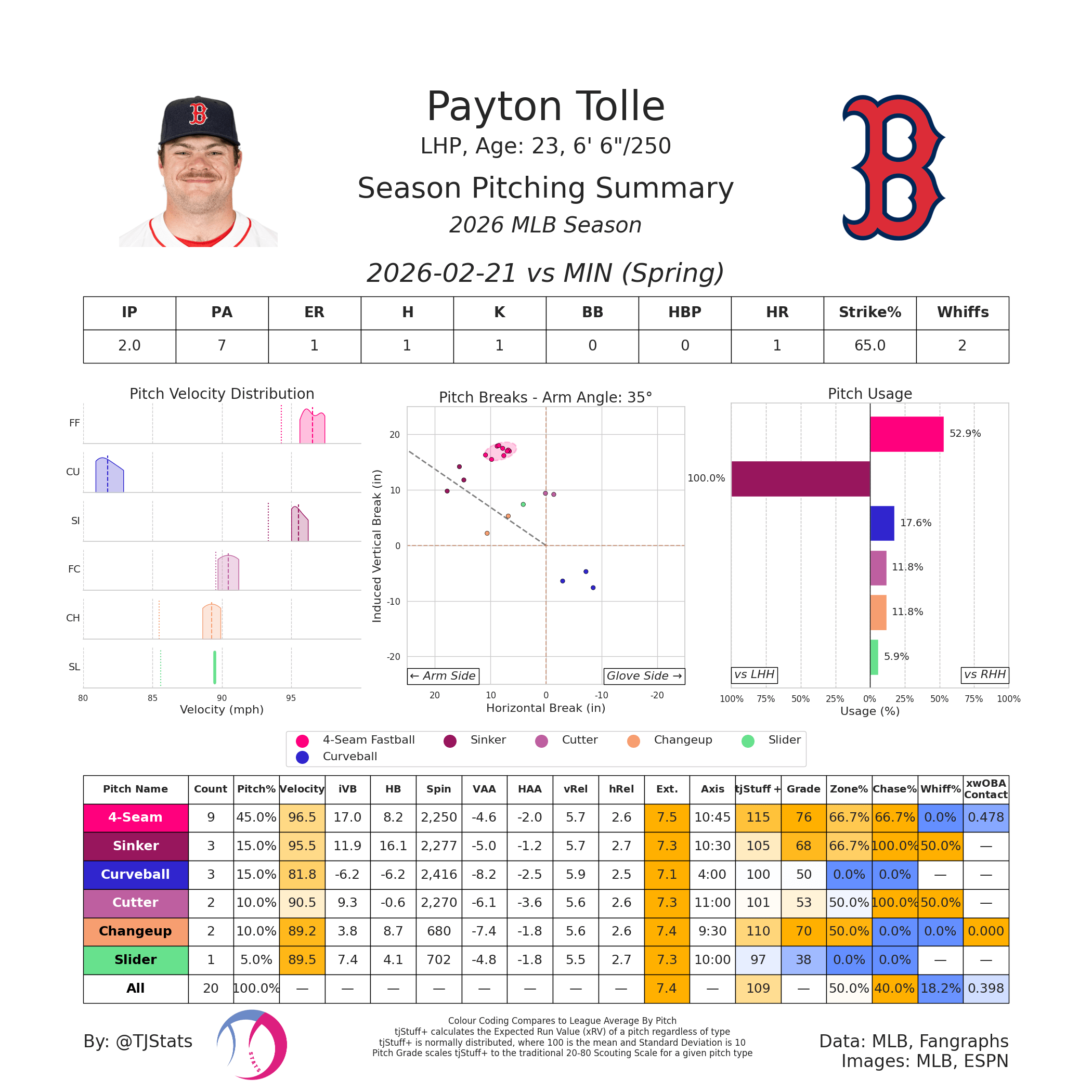 Payton Tolle (#15 Prospect) kicked off his spring his a brand new pitch -- a sinker. This addition is a great development for the sturdy southpaw as concerns regarding his reliance on his elite fastball have impacted his outlook as a starter. On a very positive note, the sinker looked sharp sitting at 95-96 MPH with stark arm-side action. Moving forward, I expect the offering to be his primary fastball against LHH. This was a great first step for Tolle this spring with the next being further development of his breaking balls.