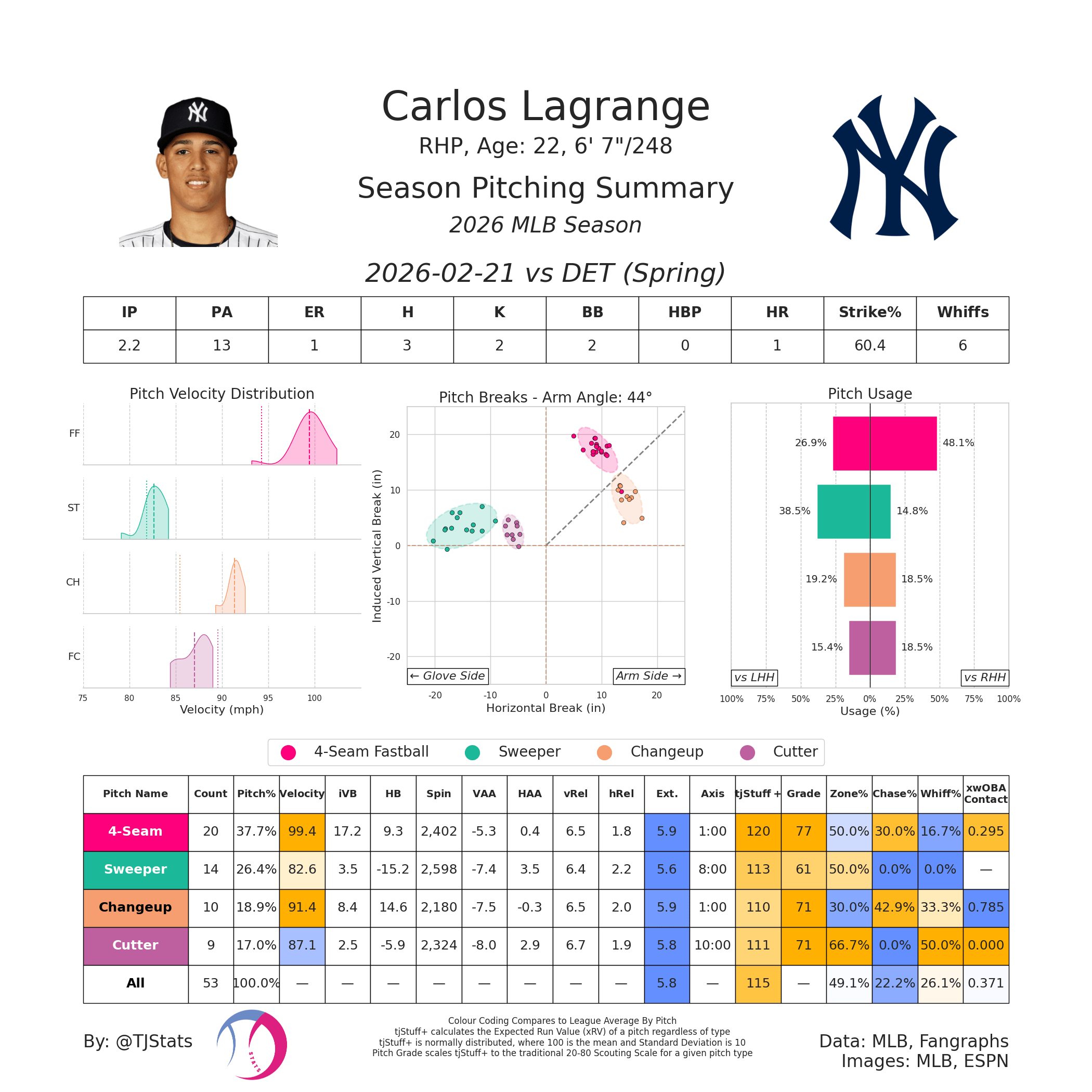 The Yankees Top Pitching Prospect (in my opinion) is Carlos Lagrange. He ranked as my #70 Prospect entering the 2026 season, and his Spring Training debut fully supported that placement. His stuff was absolutely electric as he sat triple digits on his fastball and topped out at 102.4 MPH -- nearly 2 MPH harder than the next pitcher on the day. Not only was his fastball buzzing, he flexed a pair of breaking balls and a changeup which all graded out exceptionally well. There were some bumps in the road for the flamethrowing righty as he allowed 3 hits and issues 2 walks on the day. I would not read much into the results -- it is Spring Training after all -- but command is the biggest question mark regarding his profile. Nonetheless, this outing was the start of what should be a very fun spring for Lagrange.
